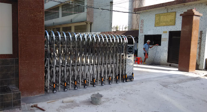 中山市开睿电子有限公司选用的是无轨道的伸缩门,除了可以遥控控制之外,还不会对地面造成损害,不会像普通的伸缩门一样,地面会有两条轨道!保安人员在保安室,看到自己公司的车辆过来,直接一按遥控器,门自动打开,让车进去!进去以后,再按遥控,使门关闭!