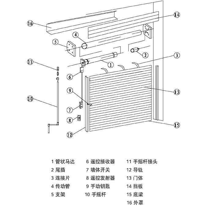 10.弹簧断裂保护:在钢丝绳断裂时,这种装置会卡到导轨里使门不会从上落下。