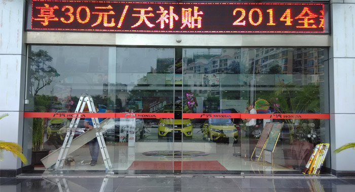 很多人说,玻璃墙就是商铺最好的橱窗,这个很对,如果已经拥有玻璃墙了,再装上一扇玻璃感应式自动门,那就是更加是橱窗之王了!中山广汽本田博爱店装的就是一扇玻璃的感应式自动门,大家看图片就知道,商家也有意把好车就放门的正对中央!特显眼!