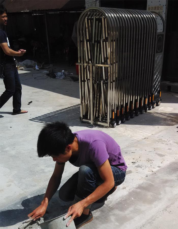 中山市开睿电子有限公司选用的是无轨道的伸缩门,除了可以遥控控制之外,还不会对地面造成损害,不会像普通的伸缩门一样,地面会有两条轨道!保安人员在保安室,看到自己公司的车辆过来,直接一按遥控器,门自动打开,让车进去!进去以后,再按遥控,使门关闭!