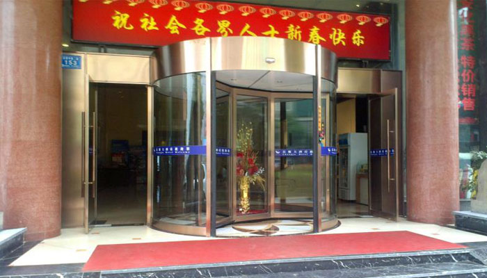 长聚大酒店是完全按照四星级的标准去装修,以及是按照四星级的规范去规范自己的员工以及服务水平!这样一个好的酒店就必须配备一个好门面,长聚大酒店选择了三翼旋转门!中间带有展柜!展柜放了鲜花,给人一种宾至如归的感觉!