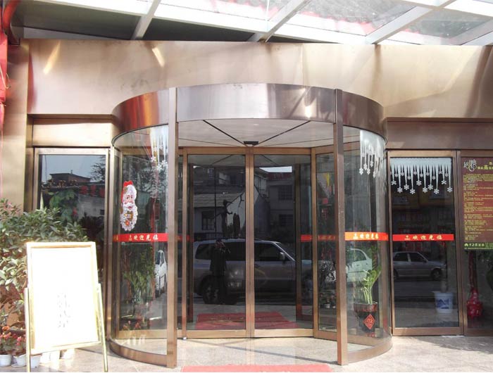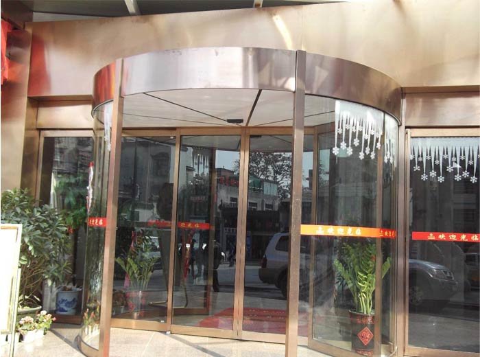君天宾馆选用的自动门类似于旋转门的自动门,主要是拥有旋转门的表面,但其实功能只是感应平移而已!虽说如此,从整体上看,该自动门还是有一定的档次的!